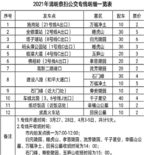 祭掃專線開收班時間為:市內始發點統一為7時至12時;歸元陵園、睡虎山、孝恩陵園、流芳陵園、千子星空、幸福山公墓、萬福凈土、回民公墓收班時間為14時;石門峰、壽安陵園、玉筍山收班時間為15時。
