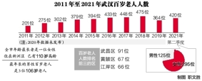 目前,全市15個區(含功能區)都有百歲老人。武昌區百歲老人最多,共有91位;其次是黃陂區67位;再次是江岸區66位。