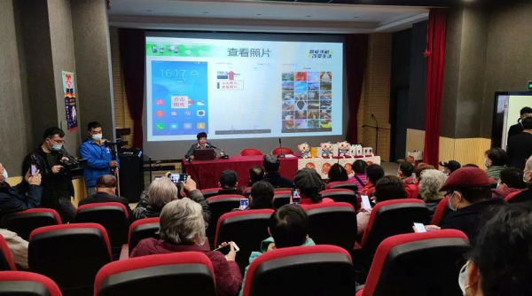 江岸電信公司科技志愿者通過現場演示、ppt展示的方式,為現場老年人詳細講解智能手機的應用方法,并就老年人常用的添加微信好友、語音發送、Wi-Fi設置等功能進行分步演示,實操教學。