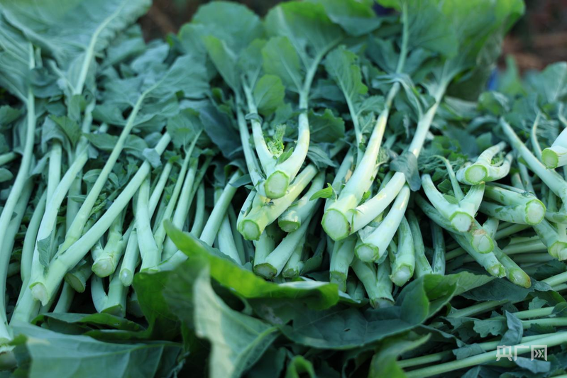 收好的油菜翠綠鮮嫩,等待分揀裝車(央廣網發 曹慧瓔 攝)