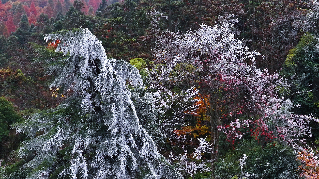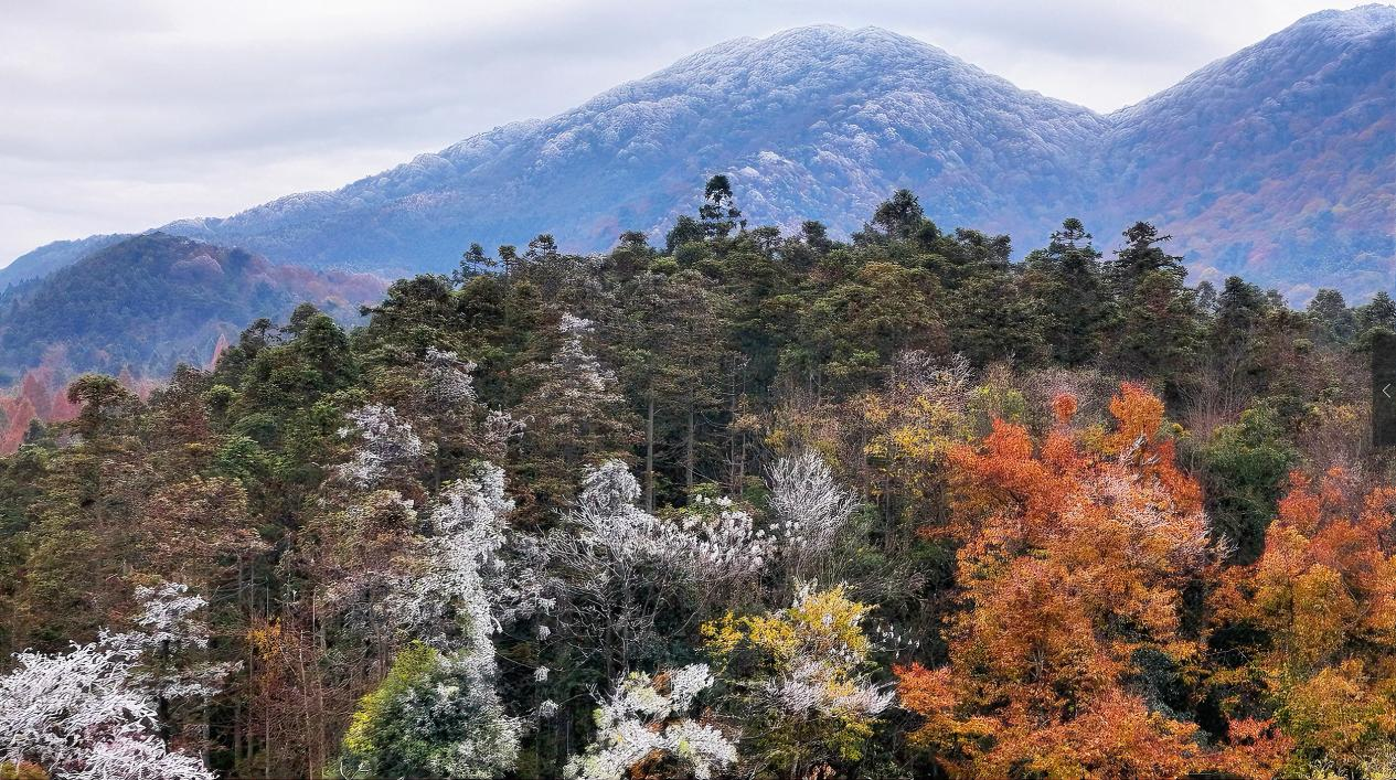 沿蜿蜒山路攀升,景致隨海拔梯度切換,宛若漫步季節縫隙。林間霧凇晶瑩剔透,枝丫綴滿碎玉般的冰晶;山腰層林盡染,紅楓似朱砂、白櫟如金箔、青松守蒼翠,朱紅、橙黃、翠綠交織成景,為初冬山林添就別樣韻味。
