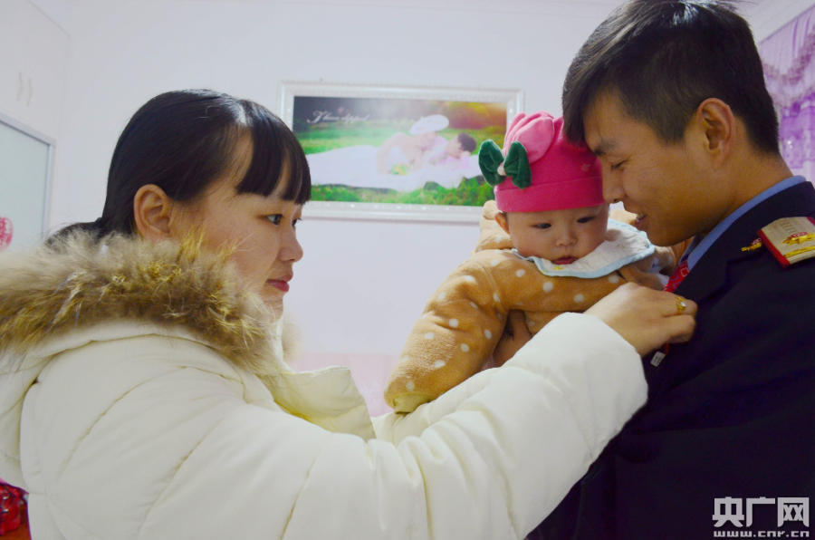 出乘前, 譚住寶再次抱了一下女兒。妻子白媛則在一旁為他整理領(lǐng)帶。這對(duì)小夫妻結(jié)婚一年,在一起的時(shí)間卻是少的可憐,剛結(jié)婚那會(huì)兒,白媛還有點(diǎn)抱怨,后來(lái)了解到忙是火車(chē)司機(jī)的職業(yè)特點(diǎn),她也就慢慢理解,現(xiàn)在是非常支持老公的工作。但是,今天是除夕,老公卻要出乘,她還是有點(diǎn)不舍。 出乘前,妻子為譚住寶整理領(lǐng)帶 -
