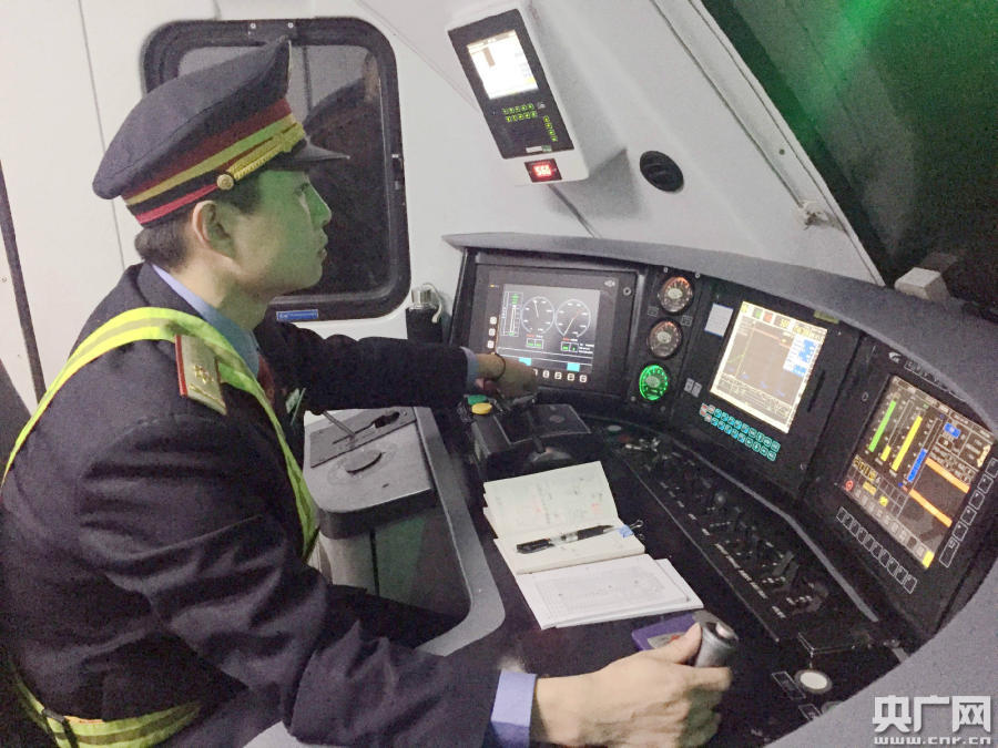 零時(shí)37分,T82次列車(chē)緩緩從衡陽(yáng)站開(kāi)出,一頭扎進(jìn)濃濃夜色,駛向株洲。列車(chē)啟動(dòng)后,剩下的工作主要是“看天看地”了。所謂“看天”,就是看列車(chē)上方的接觸網(wǎng)有無(wú)異常。接觸網(wǎng)是給列車(chē)供電的,出現(xiàn)故障非同小可。所謂“看地”就是路面狀況,其中信號(hào)燈是關(guān)鍵。“火車(chē)司機(jī)吃的是瞭望飯,看清地面信號(hào)開(kāi)車(chē)就不難。”對(duì)此,小譚深有體會(huì)。 譚住寶在駕駛機(jī)車(chē) -