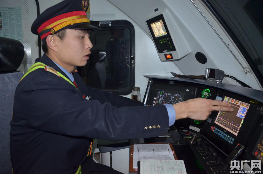 火車(chē)司機(jī)工作中除了需要精神高度集中,口、手、腳也不能閑著。一路上,每接近一架地面信號(hào)機(jī),譚住寶便大聲呼喚信號(hào)顯示情況,右手做出手勢(shì)比對(duì)確認(rèn);通過(guò)車(chē)站時(shí),用腳踩響鳴笛,一直忙個(gè)不停。這樣簡(jiǎn)單卻又枯燥的動(dòng)作,他一次出乘作業(yè)要重復(fù)超過(guò)300次。 譚住寶在執(zhí)行標(biāo)準(zhǔn)化作業(yè)手勢(shì) -