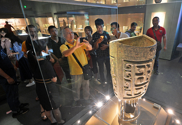 5月18日,市民在象紋大銅鐃文物前觀賞、拍照。當天是國際博物館日,“湘江北去·中流擊水——長沙歷史文化陳列”開幕式在長沙博物館舉行。本次展覽分古代篇和近代篇兩個部分,共4個展廳,展出文物1250余件(套),使用各種資料圖片2400余張,綜合運用場景復原、雕塑、多媒體、動畫視頻、虛擬現實裝置、動手體驗裝置、電子科技輔助展項80余處。展覽以長沙重大歷史事件、著名歷史人物、城市的發展變遷為主線,以長沙出土和征集的精美文物為主要載體,講述長沙故事,市民可持身份證到場免費領票參觀。 湖南日報記者 李健 通訊員 鄧曉麗 攝影報道
