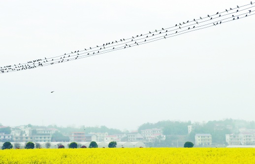 3月19日,漣源市橋頭河鎮(zhèn)珠璜村,許多小鳥在電線上休憩,似一串串跳動的音符。隨著氣溫回升,大地春花綻放,群鳥曼舞,處處呈現(xiàn)一片生機(jī)勃勃的景象。