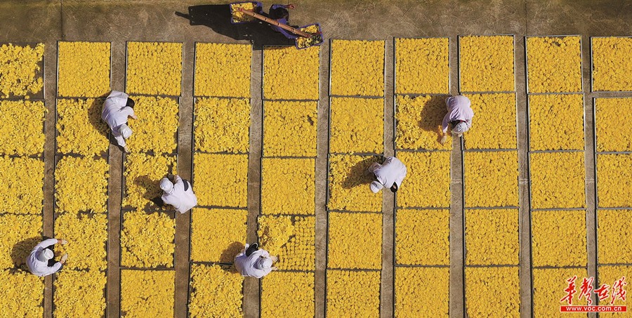 11月3日,衡陽市南岳區(qū)壽岳鄉(xiāng)岳林村凰菊種植基地,菊農(nóng)在晾曬菊花。金秋時節(jié),該基地的600余畝高山凰菊進入收獲采摘期,當(dāng)?shù)鼐辙r(nóng)搶抓晴好天氣進行采摘、加工,確保凰菊的豐產(chǎn)增收。