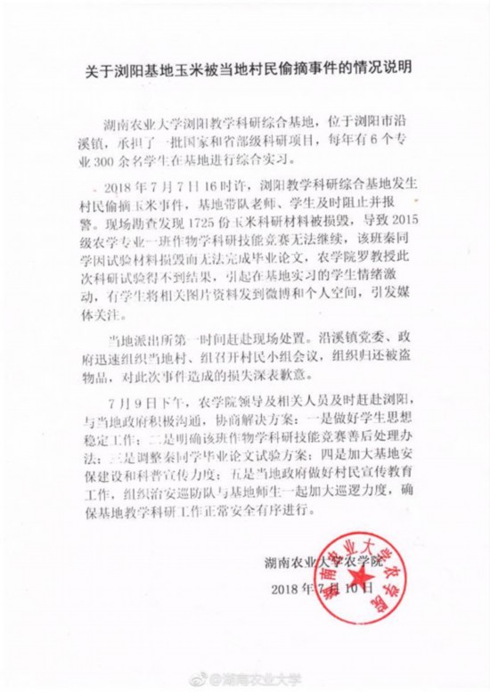 2018年7月7日16時許,瀏陽教學科研綜合基地發生村民偷摘玉米事件,基地帶隊老師、學生及時阻止并報警。現場勘查發現1725份玉米科研材料被損毀,導致2015級農學專業一班作物學科研技能競賽無法繼續,該班秦同學因試驗材料損毀而無法完成畢業論文,農學院羅教授此次科研試驗得不到結果,引起在基地實習的學生情緒激動,有學生將相關圖片資料發到微博和個人空間,引發媒體關注。