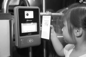 8月26日,長沙139路公交車,小朋友拿著家長的手機,準備用“湘行一卡通”APP掃碼乘坐公交車。圖/實習生張云峰記者金林