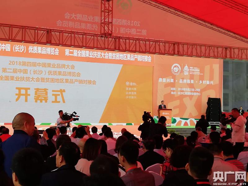 央廣網(wǎng)長沙9月27日消息(記者鄧文輝)9月27日,2018第四屆中國果業(yè)品牌大會、第二屆中國(長沙)優(yōu)質(zhì)果品博覽會、第二屆全國果業(yè)扶貧大會暨貧困地區(qū)果品產(chǎn)銷對接會(以下簡稱大會)在長沙紅星國際會展中心南廣場開幕,來自全國各地的領(lǐng)導(dǎo)嘉賓、專家學(xué)者,客商、種植大戶共同參加了開幕式,共商中國果業(yè)轉(zhuǎn)型升級、果業(yè)扶貧大計。