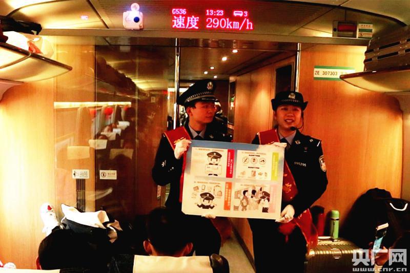 當天,乘警支隊的青年民警踏上桂林至長沙南的高鐵列車,利用自己制作小展板講解春運安全小知識,推廣微信報警平臺和衡陽鐵警青年公眾號,向廣大旅客宣傳文明乘車相關規范,并及時發現、勸導在車廂內奔跑、吵鬧等不文明行為,宣傳在列車內吸煙、霸座是違法行為,營造和諧、溫馨、有序的旅途環境。民警還采取有獎問答的方式吸引了眾多乘客的參與,一問一答之間,春運安全小知識和常見警情及防范技巧便被旅客們記在了心里。與此同時,乘警支隊青年沖鋒隊還邀請了列車乘警——衡陽鐵路公安處乘警支隊歐廣偉警長給旅客們分享了列車常見警情和防范措施,乘客都認真聆聽。