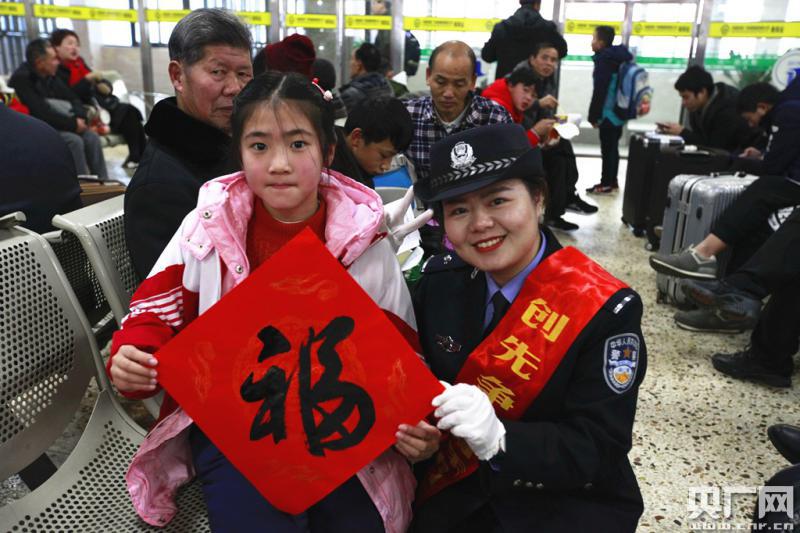 (青年民警向旅客贈送“福”字 央廣網發 邱旭琳攝)