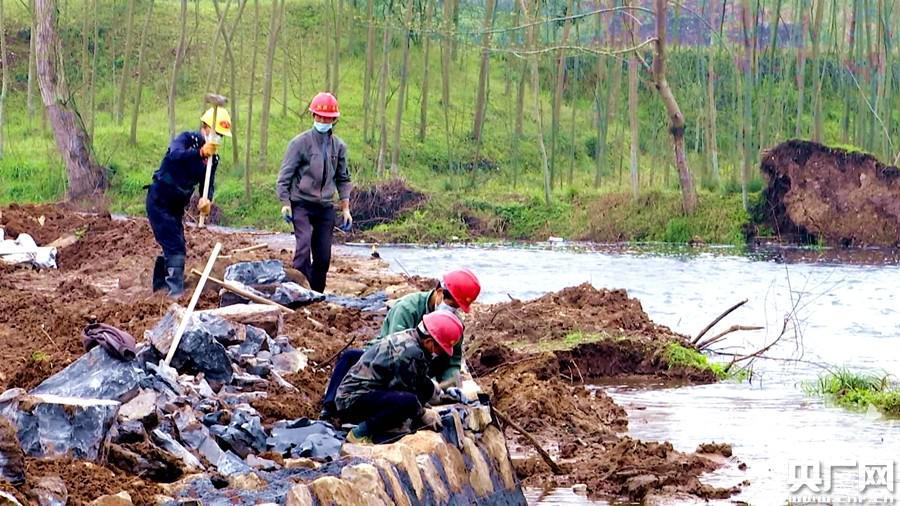工人們在延溪河三陽港鎮河段開展河岸整治(央廣網發 通訊員供圖)