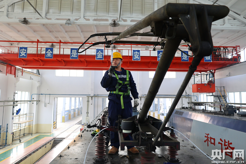 株洲檢修職工在電力小輔修庫測量機車受電弓靜態(tài)壓力(央廣網(wǎng)發(fā) 通訊員許彬 攝)