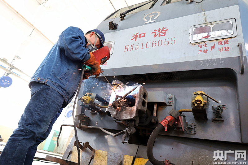 株洲檢修職工在電力小輔修庫對機車車鉤進(jìn)行防跳堆焊(央廣網(wǎng)發(fā) 通訊員許彬 攝)