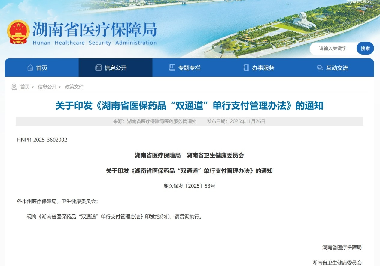 可線上申請、異地結算,享受最長兩個自然年度待遇,醫療救助對象個人自付費用可享受醫療救助……近日,湖南省發布《醫保藥品“雙通道”單行支付管理辦法》(以下簡稱《管理辦法》),自2026年1月1日起正式施行,通過統一支付政策、優化經辦服務、強化供應監管,讓參保人在醫院和藥店購買高價醫保藥品時,報銷更省心、用藥更可及。