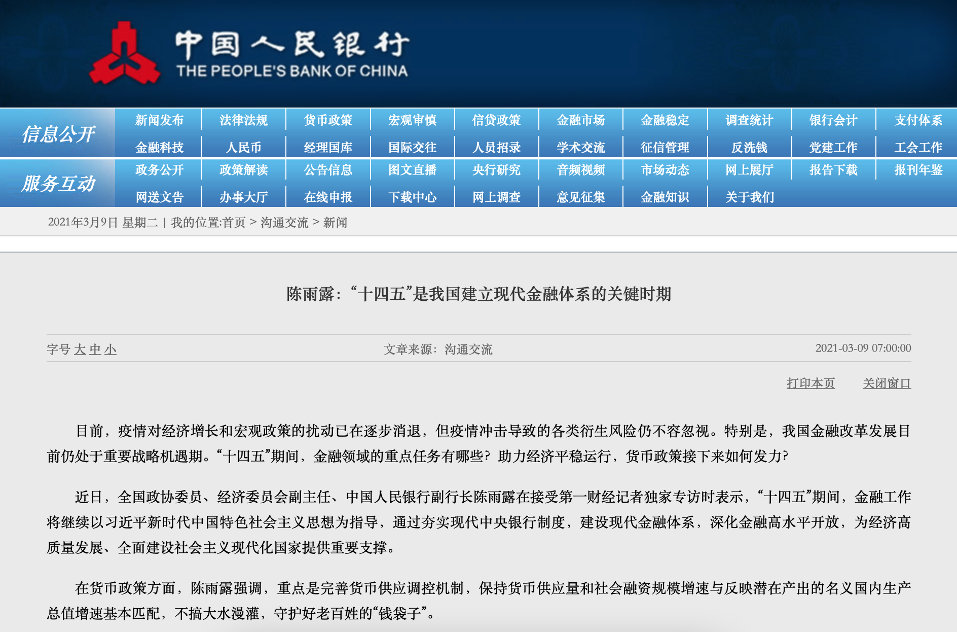 陳雨露:“十四五”是“兩個一百年”奮斗目標的歷史交匯時期,也是我們建立現代金融體系的關鍵時期。人民銀行將認真履行國務院金融委辦公室職責,按照市場化、法治化、國際化原則,持續推動建設現代金融體系,進一步打通金融向實體經濟的傳導,更好支持國民經濟重點領域和薄弱環節,更好支持加快構建雙循環新發展格局。