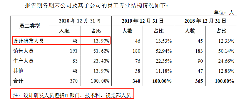 招股說明書顯示,戎美股份2020年間研發投入占其營業收入的比例僅為1.42%。從研發人員的數量上來看,2020年,戎美股份的設計研發人員有48人,占其員工人數的比例為12.97%,值得注意的是,這48人中還包含了IT部門、技術科、視覺部人員。