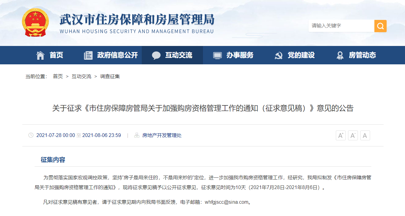28日,武漢市住房保障和房屋管理局發布《武漢市住房保障房管局關于加強購房資格管理工作的通知(征求意見稿)》(以下簡稱“意見稿”),征求意見時間為10天(2021年7月28日-2021年8月6日)。