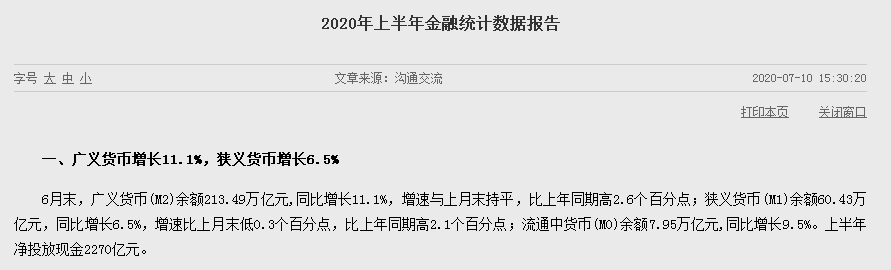 央廣網北京7月10日消息(記者 王雨馨)10日下午,央行網站公布2020年上半年金融統計數據,6月末,廣義貨幣(M2)余額213.49萬億元,同比增長11.1%,增速與上月末持平,比上年同期高2.6個百分點;狹義貨幣(M1)余額60.43萬億元,同比增長6.5%,增速比上月末低0.3個百分點,比上年同期高2.1個百分點;流通中貨幣(M0)余額7.95萬億元,同比增長9.5%。上半年凈投放現金2270億元。