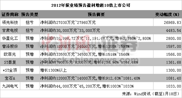 業(yè)績報喜公司中,領(lǐng)先科技、甘肅電投、華星化工、普洛股份、歐菲光、ST泰復(fù)、*ST金頂、寶石A、九洲電氣業(yè)績盈利增超10倍。其中,業(yè)績扭虧的領(lǐng)先科技和甘肅電投預(yù)計業(yè)績最高增長269倍和44倍居前兩位。