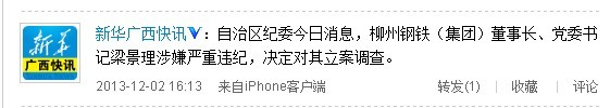 自治區紀委今日消息,柳州鋼鐵(集團)董事長、黨委書記梁景理涉嫌嚴重違紀,決定對其立案調查。