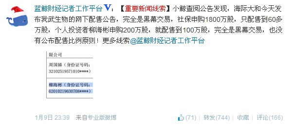 名字為@藍鯨財經記者工作平臺的微博爆料稱,“海際大和今天發布我武生物的網下配售公告,完全是黑幕交易,社保申購1800萬股,只配售到60多萬股,個人投資者柳海彬申購200萬股,就配售到100萬股,完全是黑幕交易,也沒有公布配售比例原則!”