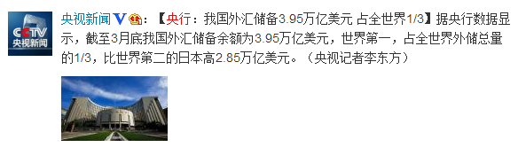 【央行:我國外匯儲備3.95萬億美元占全世界1/3】據央行數據顯示,截至3月底我國外匯儲備余額為3.95萬億美元,世界第一,占全世界外儲總量的1/3,比世界第二的日本高2.85萬億美元。(央視記者李東方)