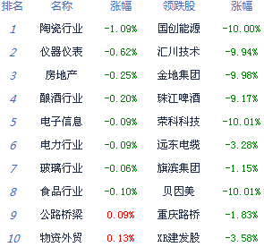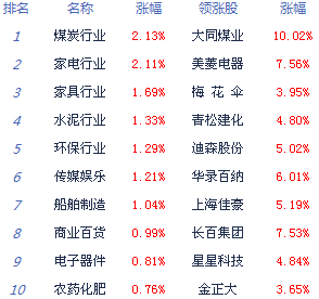 盤面上,蘋果概念、充電樁、煤炭板塊、節能照明、新疆板塊漲幅靠前。人腦工程、西藏板塊、豬肉概念跌幅靠前。