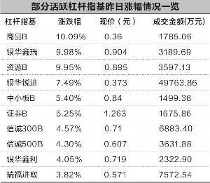 不僅上述三只,活躍品種中,銀華銳進、中小板B、證券B等漲幅也超過5%,這幾只杠桿指基跟蹤的指數既有中小板、深證100,也有申萬證券行業(yè)指數。剔除少數成交不活躍的品種,杠桿指基昨日全部普漲。