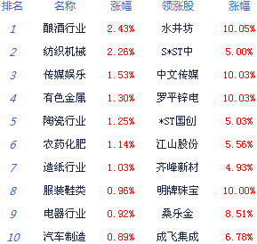盤面上看,白酒、機器人、葡萄酒、養老概念漲幅居前。天津自貿區、鈦白粉、石墨烯概念跌幅靠前。截止午間收盤,滬指報2032.38,漲幅0.4%;深成指報7231.63,漲幅0.54%;創業板指報1369.16,漲幅0.58%。