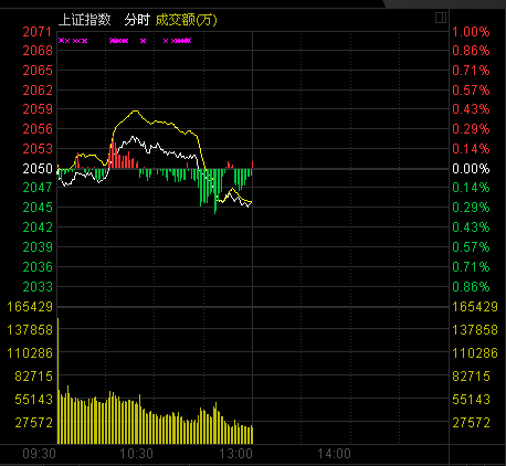 截至午盤,滬指報2045.66點,下跌4.72點,跌幅0.23%,成交497.0億元;深成指報7263.72點,下跌33.78點,跌幅0.46%,成交770.6億元;創業板指報1403.33點,下跌8.41點,跌幅0.60%,成交215.5億元。