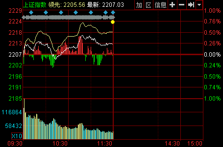 新華網消息 27日滬深兩市早盤維持震蕩。滬指在2210點縮量盤整,深成指小幅上揚,技術上站穩30日均線;創業板高開高走一度漲逾1%。截至午盤,滬指報2212.12點,上漲5.01點,漲幅0.23%,成交600.87億元;深成指報7869.99點,上漲56.01點,漲幅0.72%,成交762.83億元;創業板指報1424.22點,上漲13.07點,漲幅0.93%,成交141.73億元。