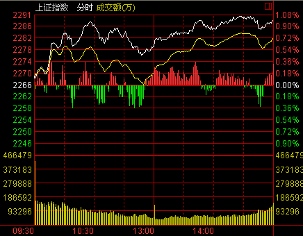 新華網(wǎng)消息 今日兩市高開,早盤小幅沖高后維持震蕩走勢,市場交投持續(xù)活躍,成交量溫和放大,權(quán)重藍(lán)籌再成指數(shù)上漲的主力。午后滬指創(chuàng)出反彈新高2290.55點,最終報收四連陽。