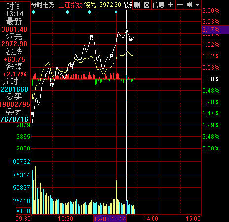 央廣網(wǎng)財經(jīng)12月8日消息 今日午后大盤延續(xù)上漲趨勢,開盤僅14分鐘,滬指便沖破3000點大關(guān),略微下跌后再次站上3000點,創(chuàng)44個月新高。