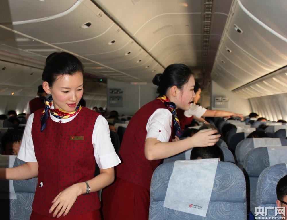 15名乘務員已經提前50分鐘上飛機,檢查所有的安全設備,為旅客清點機供品、配備的禮品,同時進行客艙的布置。一切準備就緒后,兩位乘務長孟繁玉和陳佳在門口恭候旅客登機。為了迎接新春,國航所有的乘務員都換成紅色的制服,以此來襯托新年的喜慶氣氛。