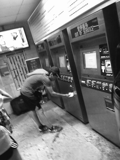 在B進(jìn)站口處,有一名專門負(fù)責(zé)從售票機(jī)買票的戴帽子男子,他先是混在人群里,到人工售票口排隊(duì)買票,但并沒有從售票窗口買出票來,于是他到自動售票機(jī)前,先用一些硬幣買出幾張票,又拿出一張紙幣投進(jìn)去,但是嘗試了幾次都沒買出票。這時(shí)候,一名大個子地鐵工作人員向他大喊,男子馬上跑向站外。