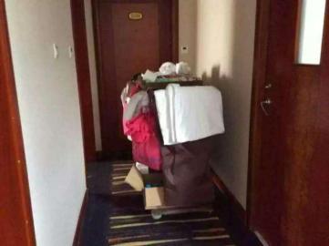 同一包裝的礦泉水和“除銹劑”都放在酒店的服務車上。