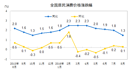 2016年8月份,全國居民消費價格總水平同比上漲1.3%。其中,城市上漲1.4%,農村上漲1.0%;食品價格上漲1.3%,非食品價格上漲1.4%;消費品價格上漲0.9%,服務價格上漲2.1%。