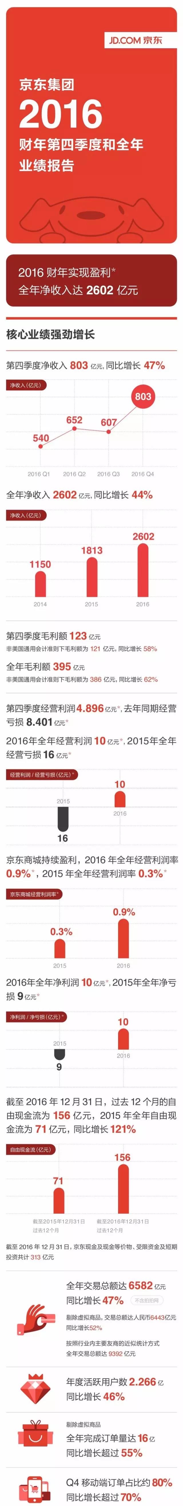 截至2016年12月31日,京東過去12個月的活躍用戶數為2.266億,較去年同期剔除拍拍網獨立用戶后的1.55億活躍用戶數,同比增長46%。