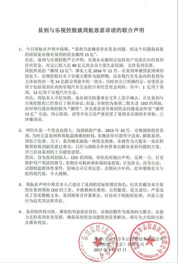 這份聯(lián)合聲明中,蓋上了樂視控股和易到運(yùn)營(yíng)主體北京東方車云信息技術(shù)有限公司的紅色印章。