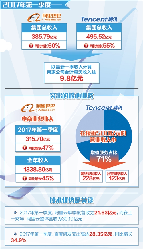 2016/2017財(cái)年第四季度(2017年1月份到2017年3月31日),阿里巴巴集團(tuán)總收入同比增長(zhǎng)60%,達(dá)到385.79億元,全年阿里巴巴集團(tuán)收入為1582.73億元,同比增長(zhǎng)56%。2017年第一季度,騰訊總收入為495.52億元,同比增長(zhǎng)55%。凈利潤(rùn)為144.76億元,同比增長(zhǎng)58%。以最新一季收入計(jì)算,兩家公司合計(jì)每天收入達(dá)9.8億元。