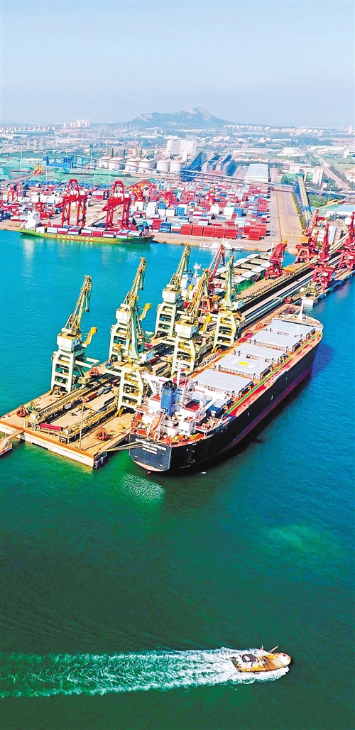 圖③ 這是2017年9月12日航拍的日照港。日照港搶抓“一帶一路”國(guó)家戰(zhàn)略機(jī)遇,先后開(kāi)通“日照—中東”件雜貨班輪航線(xiàn)和“日照—中亞”集裝箱國(guó)際班列等。新華社記者 郭緒雷攝