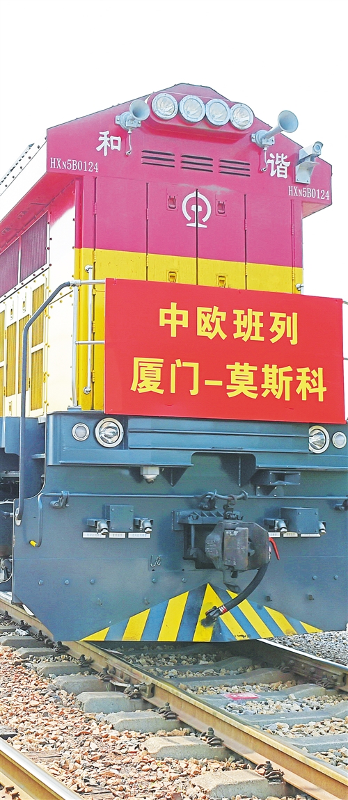 圖④ 中歐(廈門(mén)—莫斯科)直達(dá)貨運(yùn)班列從廈門(mén)自貿(mào)區(qū)海滄貨場(chǎng)開(kāi)出。 新華社記者 林善傳攝