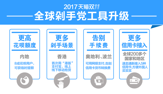 從今年雙11開始,沒有銀行卡的泰國、菲律賓用戶將可使用賬戶余額支付這一功能參與雙11購物。“國際版淘寶”速賣通用戶在原有3家信用卡品牌的基礎上,新增了5種信用卡綁定選擇,分別是MIR、ELO、DISCOVER、Diners和JCB。此外,波蘭和奧地利用戶今年可以分別使用本地在線網銀payU和EPS進行支付,避免了使用信用卡高額的貨幣轉換費用,波蘭用戶更可直接用本地貨幣。
