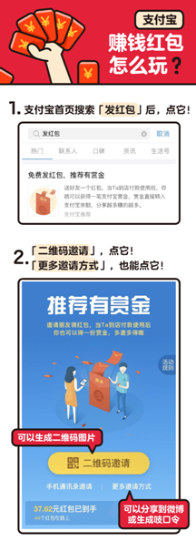 支付寶方面介紹,賺錢(qián)紅包沒(méi)有任何門(mén)檻,任何用戶(hù)都可以在支付寶首頁(yè)搜索“發(fā)紅包”,進(jìn)入“免費(fèi)發(fā)紅包,推薦有賞金”的頁(yè)面,將紅包通過(guò)吱口令、二維碼等方式分享給其他人。申請(qǐng)了收錢(qián)碼的小商家,也可以在支付寶“商家服務(wù)”功能中免費(fèi)領(lǐng)取紅包碼海報(bào),張貼在自己的門(mén)店。
