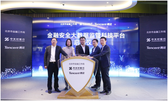 (圖為北京市金融工作局、中關村銀行及騰訊公司領導共同發布金融安全大數據監管平臺)