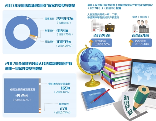 最高人民法院日前發布的《中國法院知識產權司法保護狀況(2017年)》(白皮書)披露,2017年,人民法院共新收一審、二審、申請再審等各類知識產權案件237242件,審結225678件(含舊存),比2016年分別上升33.50%和31.43%。