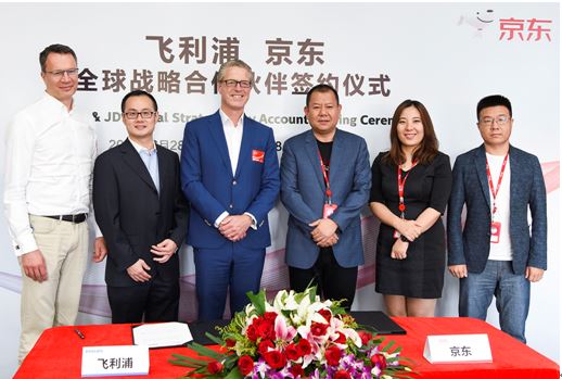 飛利浦健康生活事業群全球首席執行官范愛博(Egbert van Acht)、飛利浦健康生活事業群大中華區銷售副總裁沈天宏親自率隊到訪京東總部,與京東集團高級副總裁、京東商城電子文娛事業群總裁閆小兵,及京東家電事業部總裁劉俊,正式簽署了全球戰略合作伙伴協議。