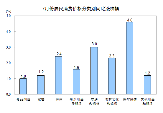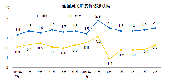 7月份,全國居民消費(fèi)價格環(huán)比上漲0.3%。其中,城市上漲0.4%,農(nóng)村上漲0.1%;食品價格上漲0.1%,非食品價格上漲0.3%;消費(fèi)品價格上漲0.1%,服務(wù)價格上漲0.7%。